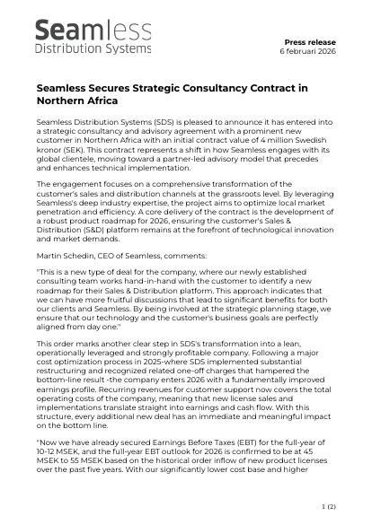 Seamless Distribution Systems (SDS) is pleased to announce it has entered into a strategic consultancy and advisory agreement with a prominent new customer in Northern Africa with an initial contract value of 4 million Swedish kronor (SEK). This contract represents a shift in how Seamless engages with its global clientele, moving toward a partner-led advisory model that precedes and enhances technical implementation.