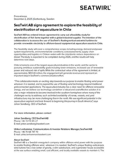 SeaTwirl AB has entered into an agreement to carry out a feasibility study for electrification of fish farms together with a global industrial supplier. The intention of the collaboration is to assess the use of SeaTwirl's floating vertical-axis wind turbines to provide renewable electricity to offshore-based equipment at aquaculture assets in Chile.
