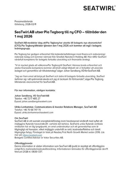 SeaTwirl AB meddelar idag att Pia Tegborg har utsetts till bolagets nya ekonomichef (CFO). Pia Tegborg tillträder tjänsten den 1 maj 2026 och kommer att ingå i bolagets ledningsgrupp.