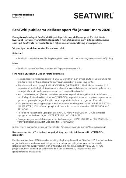 Energiteknikbolaget SeaTwirl AB (publ) publicerar delårsrapport för det första kvartalet (januari-mars) 2026. Rapporten finns tillgänglig som bifogat dokument samt på SeaTwirls hemsida. Nedan följer en sammanfattning av rapporten.