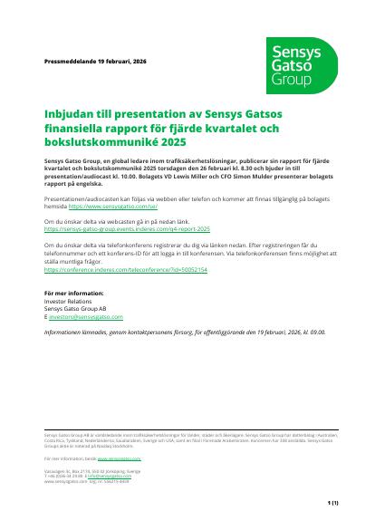 Presentationen/audiocasten kan följas via webben eller telefon och kommer att finnas tillgänglig på bolagets hemsida https://www.sensysgatso.com/se/