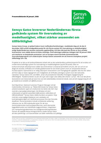 Sensys Gatso Group, en global ledare inom trafiksäkerhetslösningar, meddelade idag att de den 8 december 2025 erhöll kundgodkännande för sitt första system för övervakning av medelhastighet enligt Nederländernas senaste nationella upphandling, och blev därmed den första av fyra utvalda leverantörer som nådde denna kritiska milstolpe. Övervakningen påbörjas tisdagen den 20 januari 2026 och markerar en betydande prestation i ett av Europas mest krävande automatiserade övervakningsprogram och understryker Sensys Gatsos anseende om att leverera komplexa projekt tillförlitligt och i tid.