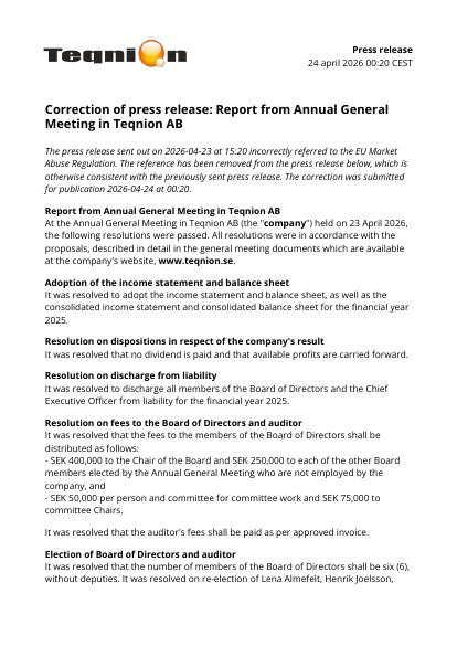 At the Annual General Meeting in Teqnion AB (the "company") held on 23 April 2026, the following resolutions were passed. All resolutions were in accordance with the proposals, described in detail in the general meeting documents which are available at the company's website, www.teqnion.se.