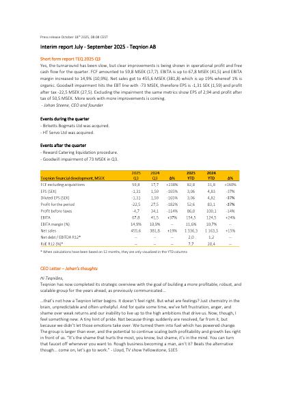 Interim report July - September 2025 - Teqnion AB