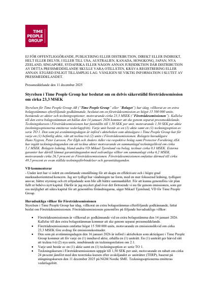Styrelsen för Time People Group AB ("Time People Group" eller "Bolaget") har idag, villkorat av en extra bolagsstämmas efterföljande godkännande, beslutat om en företrädesemission av högst 15 500 000 units, bestående av aktier och teckningsoptioner, motsvarande cirka 23,3 MSEK ("Företrädesemissionen"). Kallelse till den extra bolagsstämman att hållas den 14 januari 2026 kommer att ske genom separat pressmeddelande. Teckningskursen i Företrädesemissionen har fastställts till 1,50 SEK per unit, motsvarande 1,50 SEK per aktie (teckningsoptionerna emitteras vederlagsfritt). Varje unit består av en (1) aktie samt en (1) teckningsoption av serie TO 1. Den som på avstämningsdagen är införd i aktieboken som aktieägare i Time People Group har för varje en (1) befintlig aktie, rätt att teckna två (2) units i Företrädesemissionen. Bolagets huvudägare Hans Nygren, Peter Larsson, Per Elgh och Anders Adler via respektive bolag samt Protector Forsikring ASA har ingått teckningsåtaganden om att teckna aktier motsvarande en sammanlagd teckningslikvid om cirka 5,1 MSEK. Bolagets ledning, bland andra VD Mikael Tjernlund via bolag, tecknar cirka 0,3 MSEK. Externa garanter har därtill lämnat garantiåtaganden med sedvanliga villkor om sammanlagt cirka 6,2 MSEK, motsvarande cirka 26,5 procent av Företrädesemissionen. Företrädesemissionen omfattas därmed till cirka 49,5 procent av ovan ställda teckningsförbindelser och garantiåtaganden.