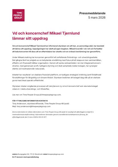 Denna information är sådan information som Time People Group AB (publ) är skyldigt att offentliggöra enligt EU:s marknadsmissbruksförordning. Informationen lämnades genom ovanstående kontaktpersons försorg, för offentliggörande den 5 mars 2026 kl 08.30 CET.