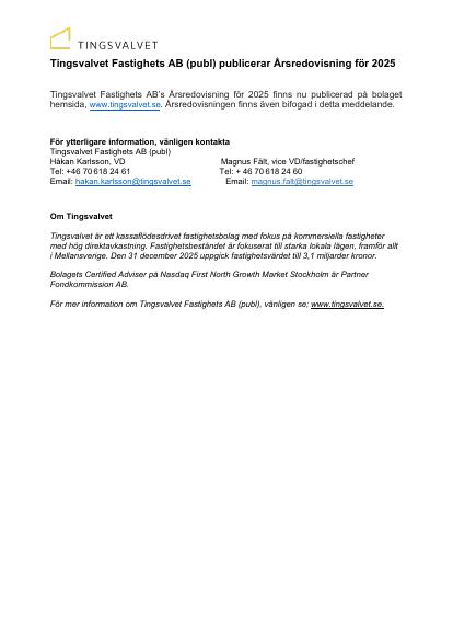 Tingsvalvet Fastighets AB's Årsredovisning för 2025 finns nu publicerad på bolaget hemsida, www.tingsvalvet.se. Årsredovisningen finns även bifogad i detta meddelande.