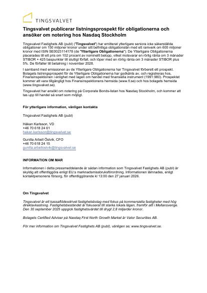 Informationen i detta pressmeddelande är sådan information som Tingsvalvet Fastighets AB (publ) är skyldig att offentliggöra enligt EU:s marknadsmissbruksförordning. Informationen lämnades, enligt kontaktpersonens försorg, för offentliggörande kl 13:00 den 27 januari 2026.