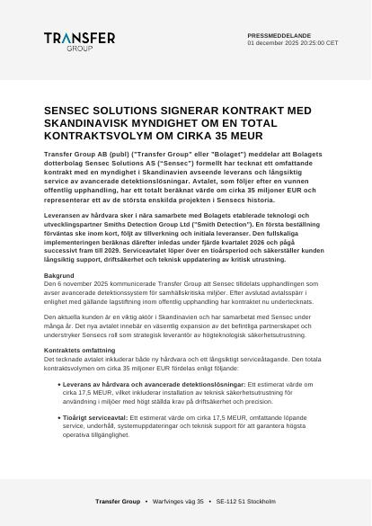 Transfer Group AB (publ) ("Transfer Group" eller "Bolaget") meddelar att Bolagets dotterbolag Sensec Solutions AS ("Sensec") formellt har tecknat ett omfattande kontrakt med en myndighet i Skandinavien avseende leverans och långsiktig service av avancerade detektionslösningar. Avtalet, som följer efter en vunnen offentlig upphandling, har ett totalt beräknat värde om cirka 35 miljoner EUR och representerar ett av de största enskilda projekten i Sensecs historia.