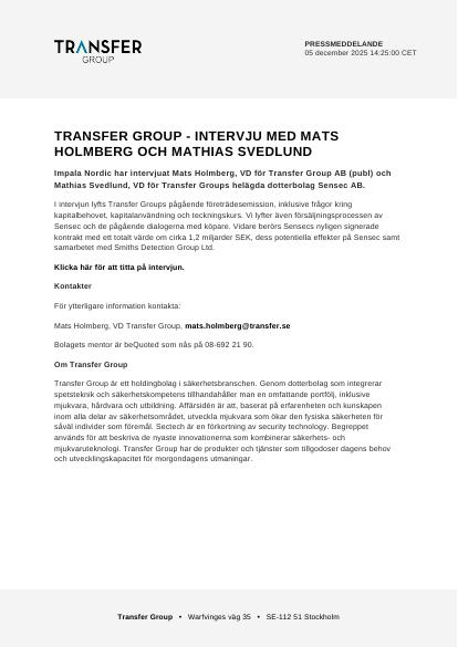 Impala Nordic har intervjuat Mats Holmberg, VD för Transfer Group AB (publ) och Mathias Svedlund, VD för Transfer Groups helägda dotterbolag Sensec AB.