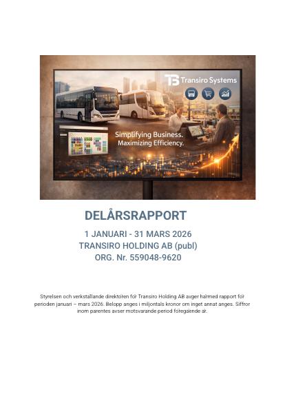 Styrelsen och verkställande direktören för Transiro Holding AB avger härmed rapport för perioden januari – mars 2026. Belopp anges i miljontals kronor om inget annat anges. Siffror inom parentes avser motsvarande period föregående år.