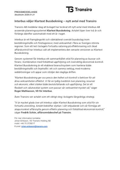 "Vi är mycket glada över att Interbus väljer Klartext Bussbokning som stöd för sin fortsatta utveckling. Avtalet bekräftar styrkan i vårt erbjudande och vår förmåga att skapa konkret affärsnytta genom effektiv planering och förbättrad ekonomisk kontroll," säger Fredrik Schön, affärsområdeschef på Transiro.