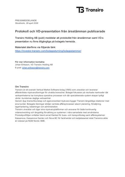 Transiro Holding AB (publ) meddelar att protokollet från årsstämman samt VD:s presentation nu finns tillgängliga på bolagets hemsida.