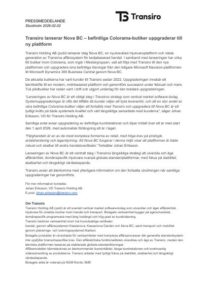 "Lanseringen av Nova BC är ett viktigt steg i Transiros strategi som vertical market software-bolag. Systemuppgraderingar är ofta det tillfälle då kunder väljer att byta leverantör, och att en stor andel av våra befintliga Colorama-butiker väljer att fortsätta med Transiro och uppgradera till Nova BC är ett tydligt kvitto på både systemets kvalitet och vårt långsiktiga samarbete med kunderna", säger Johan Eriksson, VD för Transiro Holding AB.