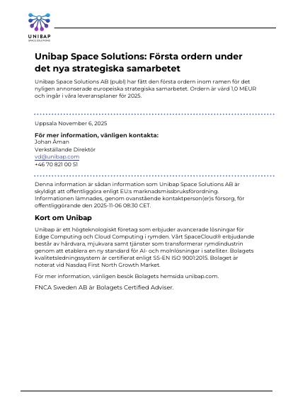 Denna information är sådan information som Unibap Space Solutions AB är skyldigt att offentliggöra enligt EU:s marknadsmissbruksförordning. Informationen lämnades, genom ovanstående kontaktperson(er)s försorg, för offentliggörande den 2025-11-06 08:30 CET.