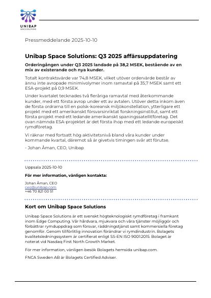 Unibap Space Solutions: Q3 2025 affärsuppdatering