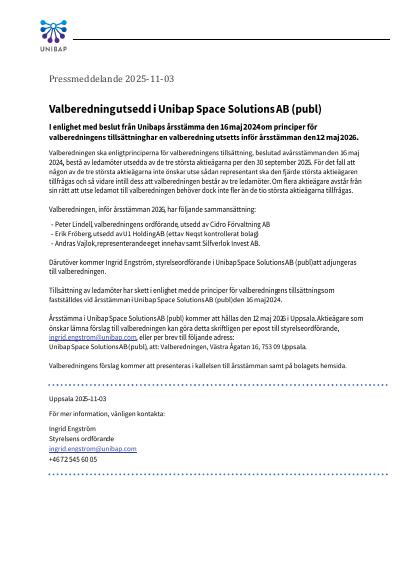 Årsstämma i Unibap Space Solutions AB (publ) kommer att hållas den 12 maj 2026 i Uppsala. Aktieägare som önskar lämna förslag till valberedningen kan göra detta skriftligen per e-post till styrelseordförande, [email protected], eller per brev till följande adress: