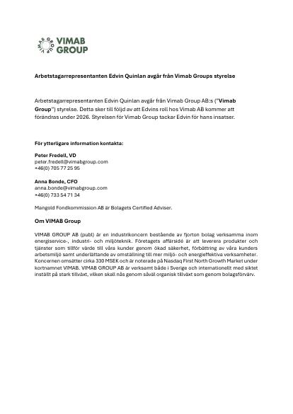 Arbetstagarrepresentanten Edvin Quinlan avgår från Vimab Group AB:s ("Vimab Group") styrelse. Detta sker till följd av att Edvins roll hos Vimab AB kommer att förändras under 2026. Styrelsen för Vimab Group tackar Edvin för hans insatser.