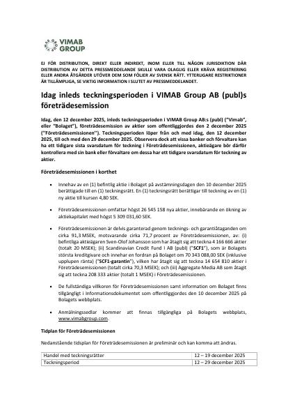Idag, den 12 december 2025, inleds teckningsperioden i VIMAB Group AB:s (publ) ("Vimab", eller "Bolaget"), företrädesemission av aktier som offentliggjordes den 2 december 2025 (''Företrädesemissionen''). Teckningsperioden löper från och med idag, den 12 december 2025, till och med den 29 december 2025. Observera dock att vissa banker och förvaltare kan ha ett tidigare sista svarsdatum för teckning i Företrädesemissionen, aktieägare bör därför kontrollera med sin bank eller förvaltare om dessa har ett tidigare svarsdatum för teckning av aktier.