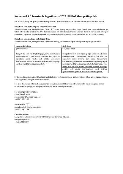Vid VIMAB Group AB (publ):s extra bolagsstämma den 9 oktober 2025 fattades bland annat följande beslut.