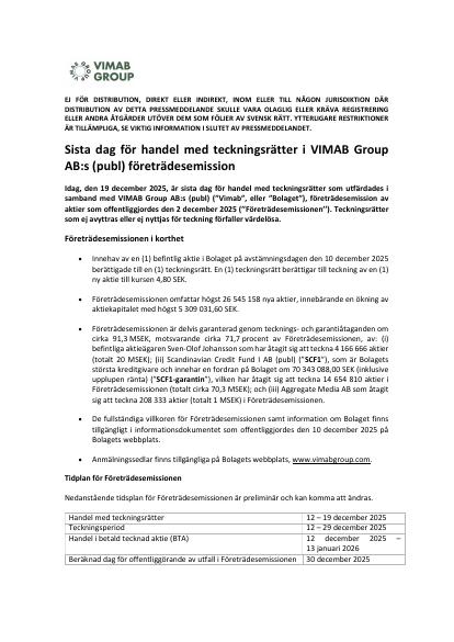 Idag, den 19 december 2025, är sista dag för handel med teckningsrätter som utfärdades i samband med VIMAB Group AB:s (publ) ("Vimab", eller "Bolaget"), företrädesemission av aktier som offentliggjordes den 2 december 2025 (''Företrädesemissionen''). Teckningsrätter som ej avyttras eller ej nyttjas för teckning förfaller värdelösa.