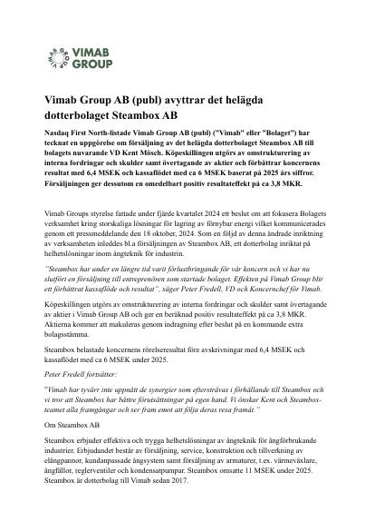 Nasdaq First North-listade Vimab Group AB (publ) ("Vimab" eller "Bolaget") har tecknat en uppgörelse om försäljning av det helägda dotterbolaget Steambox AB till bolagets nuvarande VD Kent Mösch. Köpeskillingen utgörs av omstrukturering av interna fordringar och skulder samt övertagande av aktier och förbättrar koncernens resultat med 6,4 MSEK och kassaflödet med ca 6 MSEK baserat på 2025 års siffror. Försäljningen ger dessutom en omedelbart positiv resultateffekt på ca 3,8 MKR.