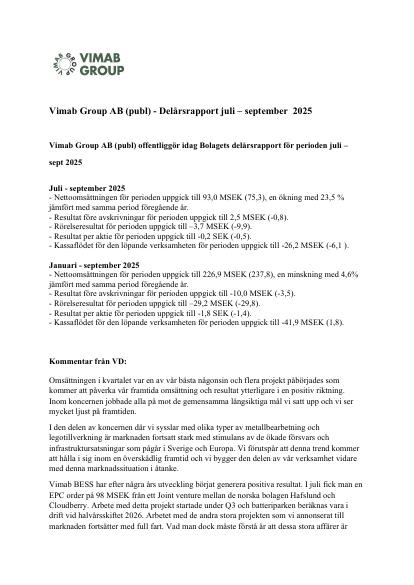 Vimab Group AB (publ) offentliggör idag Bolagets delårsrapport för perioden juli - sept 2025