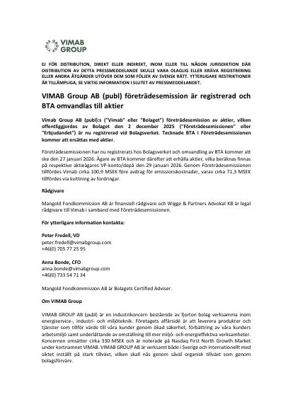 Vimab Group AB (publ):s ("Vimab" eller "Bolaget") företrädesemission av aktier, vilken offentliggjordes av Bolaget den 2 december 2025 ("Företrädesemissionen" eller "Erbjudandet") är nu registrerad vid Bolagsverket. Tecknade BTA i Företrädesemissionen kommer att ersättas med aktier.