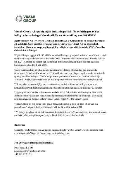 Aerix Industri AB ("Aerix"), Grimaldi Industri AB ("Grimaldi") och Bolaget har ingått ett avtal där Aerix ersätter Grimaldi som förvärvare av Vimab AB på i huvudsak identiska villkor som ursprungligen gällde enligt aktieöverlåtelseavtalet ("SPA") mellan Grimaldi och Bolaget.