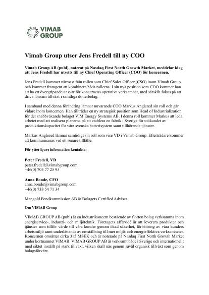 Vimab Group AB (publ), noterat på Nasdaq First North Growth Market, meddelar idag att Jens Fredell har utsetts till ny Chief Operating Officer (COO) för koncernen.