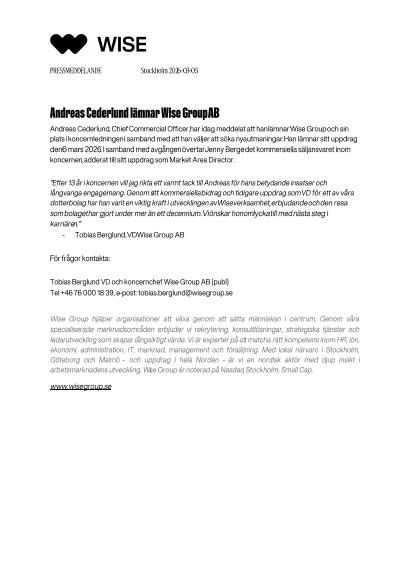 Andreas Cederlund, Chief Commercial Officer, har idag meddelat att han lämnar Wise Group och sin plats i koncernledningen i samband med att han väljer att söka nya utmaningar. Han lämnar sitt uppdrag den 6 mars 2026. I samband med avgången övertar Jenny Berge det kommersiella säljansvaret inom koncernen, adderat till sitt uppdrag som Market Area Director.