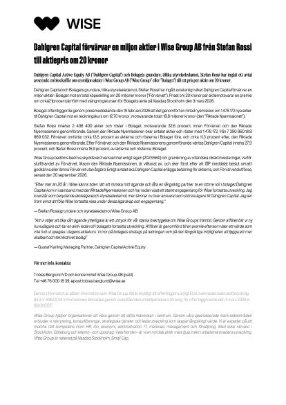 Dahlgren Capital Active Equity AB ("Dahlgren Capital") och Bolagets grundare, tillika styrelseledamot, Stefan Rossi har ingått ett avtal avseende en blockaffär om en miljon aktier i Wise Group AB ("Wise Group" eller "Bolaget") till ett pris per aktie om 20 kronor.