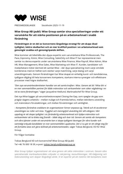 - Kompetens förändras snabbare än organisationer hinner anpassa sig. Teknik och AI accelererar utvecklingen av roller och krav. Trygghet och meningsfull utveckling blir allt viktigare. Vårt uppdrag är att skapa tydlighet i en föränderlig arbetsmarknad och hjälpa människor och verksamheter att ta kloka steg framåt - både idag och över tid. Genom att samla vår kompetens och våra tjänster under ett varumärke kan vi skapa tydligare lösningar för våra kunder och samtidigt erbjuda kandidater en mer sammanhållen upplevelse. Det vi nu gör är ett viktigt steg för att fortsätta växa och göra skillnad på arbetsmarknaden, säger Tobias Berglund, VD för Wise Group.