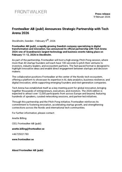 Frontwalker AB (publ), a rapidly growing Swedish company specializing in digital transformation and innovation, has announced its official partnership with Tech Arena 2026-one of Scandinavia's largest technology and business events-taking place on February 11-12, 2026 in Stockholm.