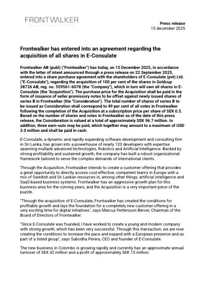 Frontwalker AB (publ) ("Frontwalker") has today, on 15 December 2025, in accordance with the letter of intent announced through a press release on 22 September 2025, entered into a share purchase agreement with the shareholders of E-Consulate (pvt) Ltd. ("E-Consulate"), regarding the acquisition of 100 per cent of the shares in Goldcup 38726 AB, reg. no. 559561-6078 (the "Company"), which in turn will own all shares in E-Consulate (the "Acquisition"). The purchase price for the Acquisition shall be paid in the form of issuance of seller promissory notes to be offset against newly issued shares of series B in Frontwalker (the "Consideration"). The total number of shares of series B to be issued as Consideration shall correspond to 49 per cent of all votes in Frontwalker following the completion of the Acquisition at a subscription price per share of SEK 0.5. Based on the number of shares and votes in Frontwalker as of the date of this press release, the Consideration is valued at a total of approximately SEK 96.7 million. In addition, three earn-outs may be paid, which together may amount to a maximum of USD 3.0 million and shall be paid in cash.