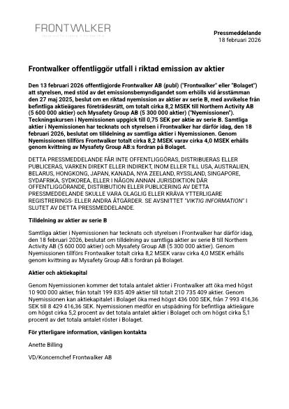 Den 13 februari 2026 offentligjorde Frontwalker AB (publ) ("Frontwalker" eller "Bolaget") att styrelsen, med stöd av det emissionsbemyndigandet som erhölls vid årsstämman den 27 maj 2025, beslut om en riktad nyemission av aktier av serie B, med avvikelse från befintliga aktieägares företrädesrätt, om totalt cirka 8,2 MSEK till Northern Activity AB (5 600 000 aktier) och Mysafety Group AB (5 300 000 aktier) ("Nyemissionen"). Teckningskursen i Nyemissionen uppgick till 0,75 SEK per aktie av serie B. Samtliga aktier i Nyemissionen har tecknats och styrelsen i Frontwalker har därför idag, den 18 februari 2026, beslutat om tilldelning av samtliga aktier i Nyemissionen. Genom Nyemissionen tillförs Frontwalker totalt cirka 8,2 MSEK varav cirka 4,0 MSEK erhålls genom kvittning av Mysafety Group AB:s fordran på Bolaget.