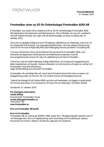 Frontwalker har utsett Ulrica Söderlund till ny VD för dotterbolaget Frontwalker ADM AB (Application Development and Maintenance). Ulrica tillträder sin nya roll i samband med att Gabriel Konrad, som själv valt att lämna bolaget, avslutar sin tjänst den 31 oktober 2025