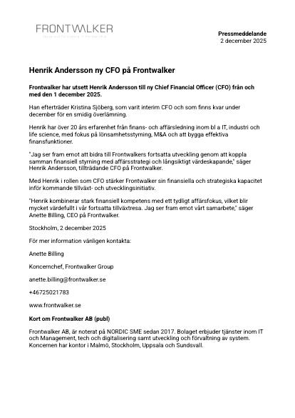 Frontwalker har utsett Henrik Andersson till ny Chief Financial Officer (CFO) från och med den 1 december 2025.