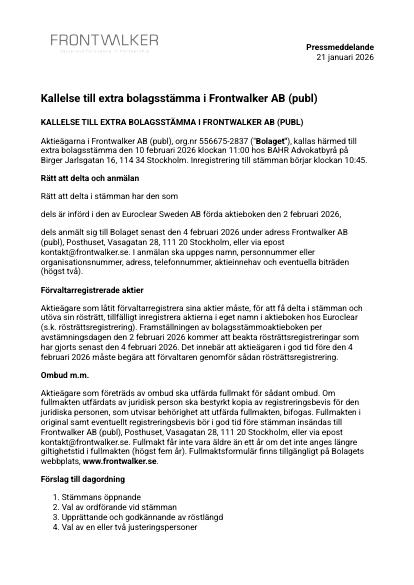 Aktieägarna i Frontwalker AB (publ), org.nr 556675-2837 ("Bolaget"), kallas härmed till extra bolagsstämma den 10 februari 2026 klockan 11:00 hos BAHR Advokatbyrå på Birger Jarlsgatan 16, 114 34 Stockholm. Inregistrering till stämman börjar klockan 10:45.