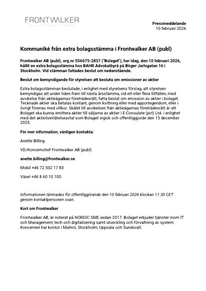 Frontwalker AB (publ), org.nr 556675-2837 ("Bolaget"), har idag, den 10 februari 2026, hållit en extra bolagsstämma hos BAHR Advokatbyrå på Birger Jarlsgatan 16 i Stockholm. Vid stämman fattades beslut om nedanstående.