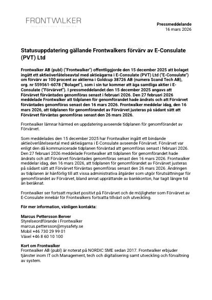 Frontwalker AB (publ) ("Frontwalker") offentliggjorde den 15 december 2025 att bolaget ingått ett aktieöverlåtelseavtal med aktieägarna i E-Consulate (PVT) Ltd ("E-Consulate") om förvärv av 100 procent av aktierna i Goldcup 38726 AB (numera Scand Tech AB), org. nr 559561-6078 ("Bolaget"), som i sin tur kommer att äga samtliga aktier i E-Consulate ("Förvärvet"). I pressmeddelandet den 15 december 2025 angavs att Förvärvet förväntades genomföras senast i februari 2026. Den 27 februari 2026 meddelade Frontwalker att tidplanen för genomförandet hade ändrats och att Förvärvet förväntades genomföras senast den 16 mars 2026. Frontwalker meddelar idag, den 16 mars 2026, att tidplanen för genomförandet av Förvärvet justeras på sådant sätt att Förvärvet förväntas genomföras senast den 26 mars 2026.
