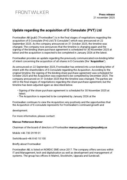 Frontwalker AB (publ) ("Frontwalker") is in the final stages of negotiations regarding the acquisition of E-Consulate (Pvt) Ltd ("E-Consulate") which was announced on 22 September 2025. As the company announced on 31 October 2025, the timeline was changed. The company now announces that the timeline is changing again and the signing of the binding share purchase agreement is scheduled for 30 November 2025 at latest and the acquisition is expected to be completed in January 2026 at the latest.