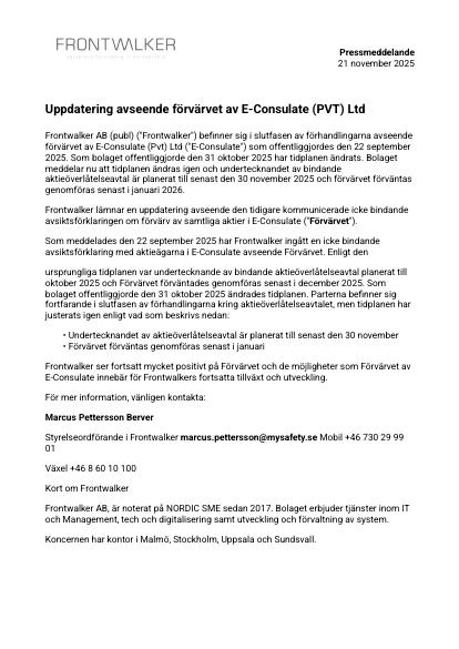 Frontwalker AB (publ) ("Frontwalker") befinner sig i slutfasen av förhandlingarna avseende förvärvet av E-Consulate (Pvt) Ltd ("E-Consulate") som offentliggjordes den 22 september 2025. Som bolaget offentliggjorde den 31 oktober 2025 har tidplanen ändrats. Bolaget meddelar nu att tidplanen ändras igen och undertecknandet av bindande aktieöverlåtelseavtal är planerat till senast den 30 november 2025 och förvärvet förväntas genomföras senast i januari 2026.